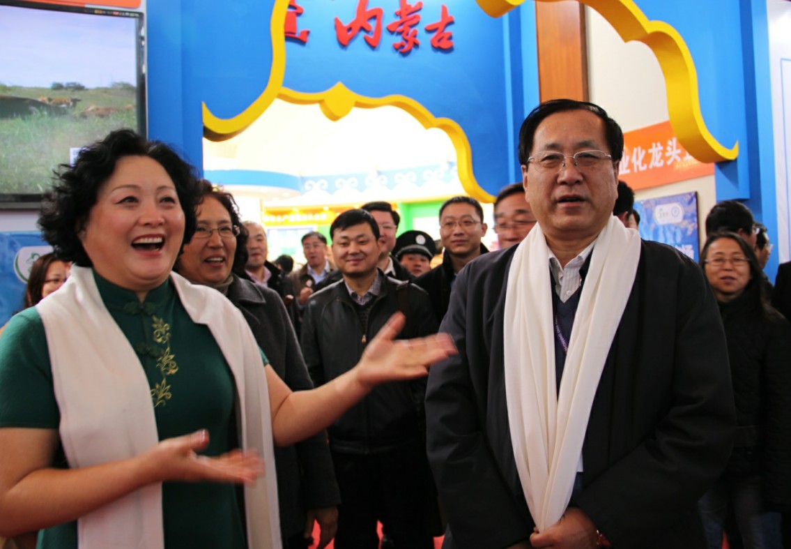 蒙元牧業(yè)董事長哈斯寶魯為王玉明副主席和郭健廳長介紹參展產(chǎn)品
