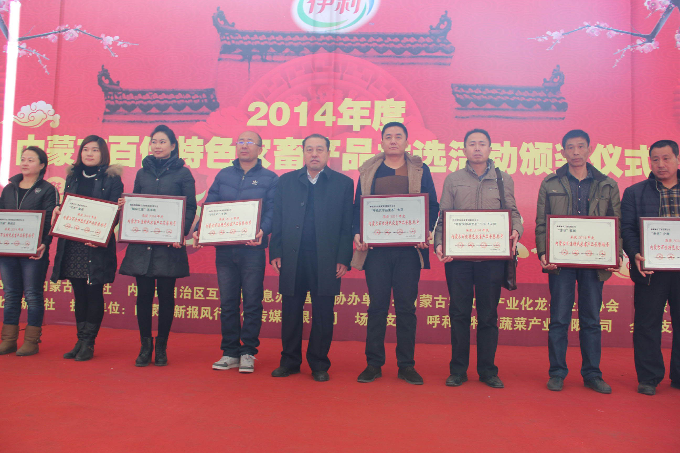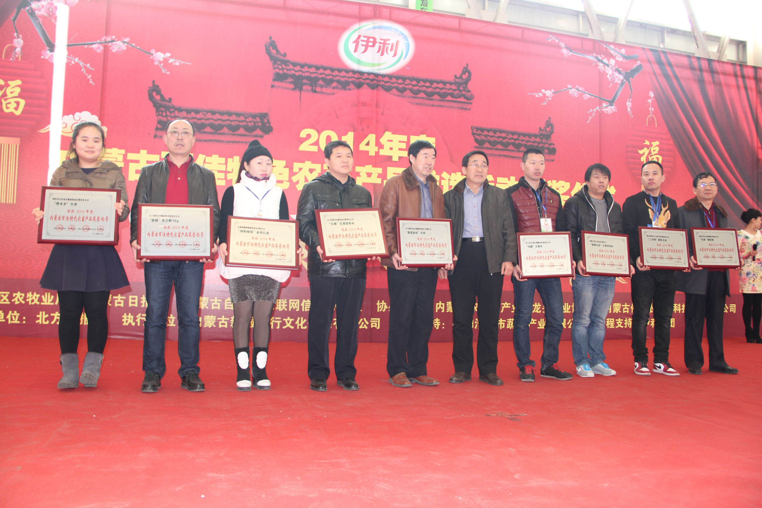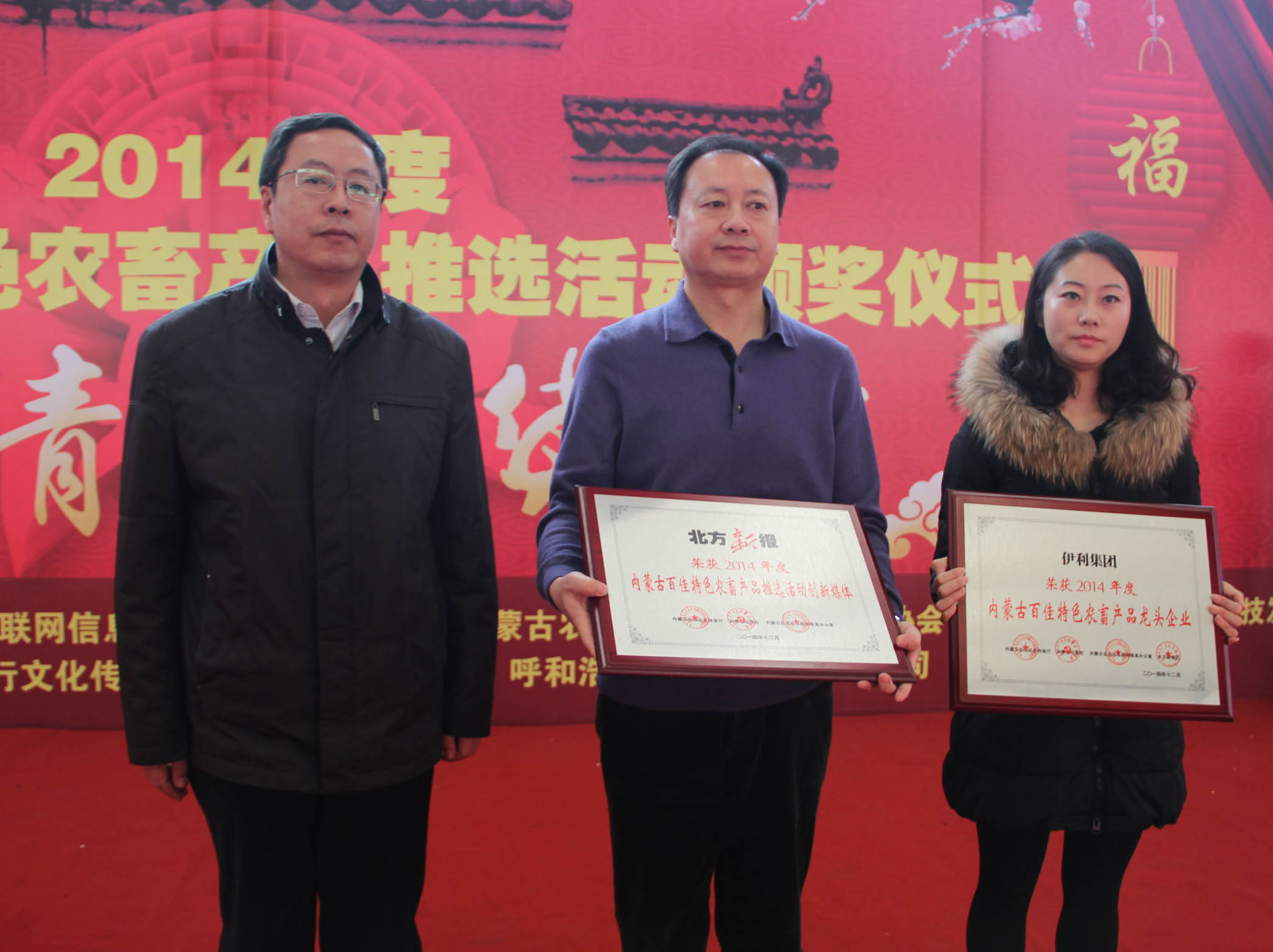 26日,由自治區(qū)農牧業(yè)廳、內蒙古日報社、自治區(qū)網信辦主辦,內蒙古農牧業(yè)產業(yè)化龍頭企業(yè)協(xié)會、內蒙古保全農產品科技發(fā)展有限公司協(xié)辦,北方新報承辦的“內蒙古百佳特色農畜產品”推選活動頒獎儀式暨2015“青城年貨大集”在呼和浩特市保全莊農貿市場2號廳正式開幕。自治區(qū)農牧業(yè)廳副廳長賈躍峰、內蒙古日報社黨委委員、副總編輯孫亞輝、內蒙古農牧業(yè)廳產業(yè)化處處長王補在、北方新報社總編輯李德斌、內蒙古農牧業(yè)產業(yè)化龍頭企業(yè)協(xié)會執(zhí)行會長林永亮等出席頒獎儀式,賈躍峰副廳長在頒獎儀式上致辭。此次評選活動共112家農牧業(yè)企業(yè)的120件產品被評選為“內蒙古百佳特色農畜產品”。獲獎企業(yè)參加了此次2015“青城年貨大集”,展出了糧油、畜、禽、魚、蛋、奶、蔬菜、水果等多種特色產品,是首府春節(jié)前夕的一次大型展示、展銷、采購活動。
