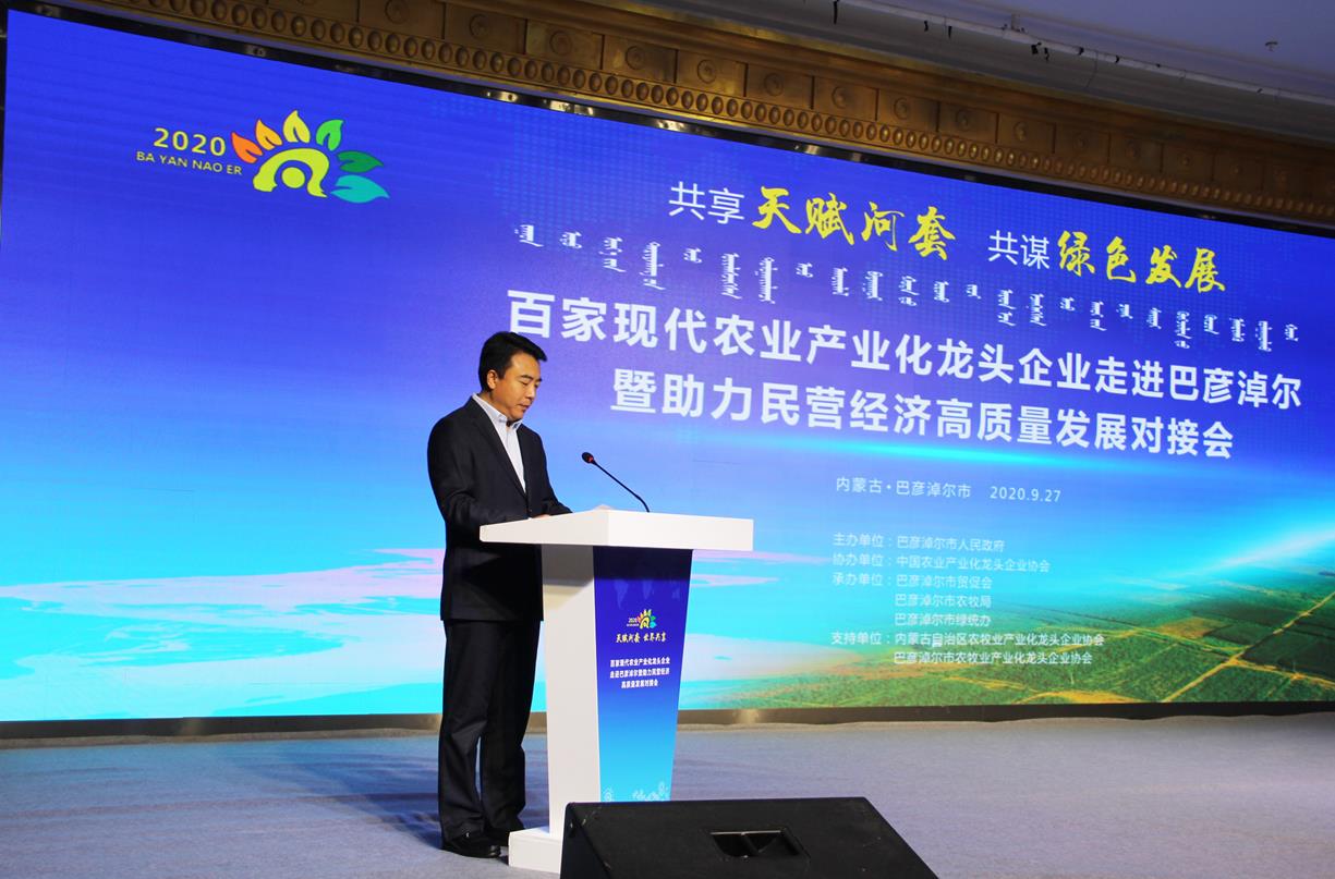 9月27日,由巴彥淖爾市人民政府主辦,中國農(nóng)業(yè)產(chǎn)業(yè)化龍頭企業(yè)協(xié)會協(xié)辦,巴彥淖爾市貿(mào)促會、巴彥淖爾市農(nóng)牧局、巴彥淖爾市綠統(tǒng)辦承辦,內(nèi)蒙古農(nóng)牧業(yè)產(chǎn)業(yè)化龍頭企業(yè)協(xié)會、巴彥淖爾市農(nóng)牧業(yè)產(chǎn)業(yè)化龍頭企業(yè)協(xié)會支持,以“共享‘天賦河套’·共謀綠色發(fā)展”為主題的百家現(xiàn)代農(nóng)業(yè)產(chǎn)業(yè)化龍頭企業(yè)走進(jìn)巴彥淖爾暨助力民營經(jīng)濟(jì)高質(zhì)量發(fā)展對接會在巴彥淖爾市臨河區(qū)召開。中國農(nóng)業(yè)產(chǎn)業(yè)化龍頭企業(yè)協(xié)會會長劉身利,中國農(nóng)科院紀(jì)檢組組長史志國,內(nèi)蒙古自治區(qū)黨委巡視二組駐巴彥淖爾市優(yōu)化營商環(huán)境專項(xiàng)工作組副組長董躍飛,巴彥淖爾市委副書記、市長張曉兵,市人大常委會主任閆鵬,市委副書記、政法委書記李中增,市委常委孫艾芳、王志平出席會議,副市長任逸群作市情推介,內(nèi)蒙古農(nóng)牧業(yè)產(chǎn)業(yè)化龍頭企業(yè)協(xié)會會長周勇應(yīng)邀出席會議。
