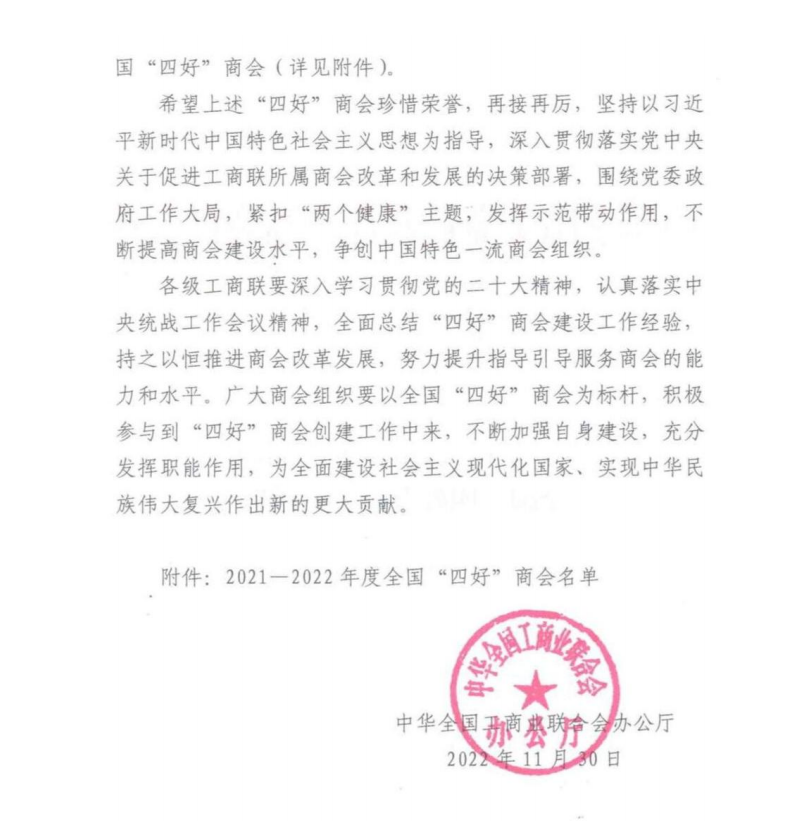 再次榮獲全國“四好”商會榮譽稱號