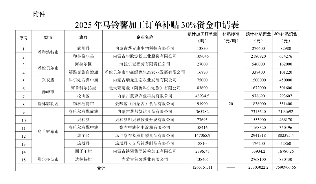 按照《內(nèi)蒙古自治區(qū)農(nóng)牧廳關(guān)于印發(fā)2025年馬鈴薯加工訂單補貼項目實施方案的通知》(內(nèi)農(nóng)牧加工發(fā)〔2025〕305號)要求,經(jīng)盟市組織申報、實地核查、公示,自治區(qū)復(fù)核,現(xiàn)將2025年相關(guān)盟市上報的馬鈴薯加工訂單補貼30%資金申請情況予以公示,公示期為15天。如對公示有異議,請及時向自治區(qū)農(nóng)牧廳反映。