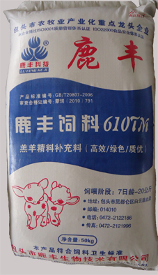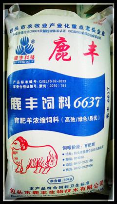 B、育肥羊濃縮飼料:執(zhí)行標準Q/BLFS02-2013,主要原料組成:豆粕、菜粕、棉粕、DDGS、石粉、磷酸氫鈣、食鹽、復(fù)合預(yù)混料等。產(chǎn)品成分保證值:粗蛋白≧35.0,粗纖維≦14.0,粗灰分≦20.0,鈣1.8-4.0,總磷≧0.8,鹽1.0-2.0,水分≦14.0、賴氨酸≧0.8。