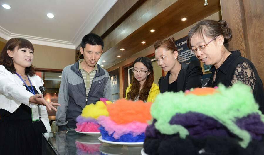 講解員在羊絨歷史文化博物館向游客介紹羊絨種類(lèi)(5月3日攝)