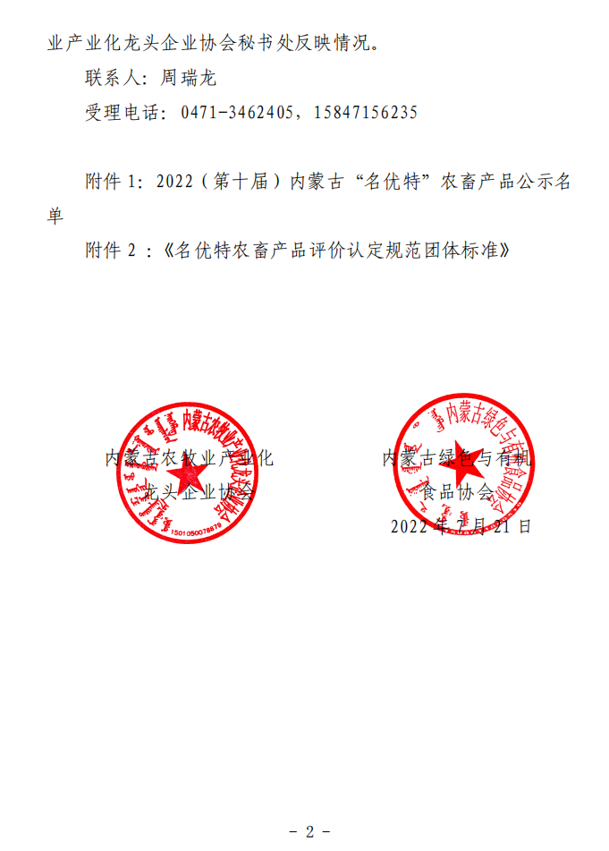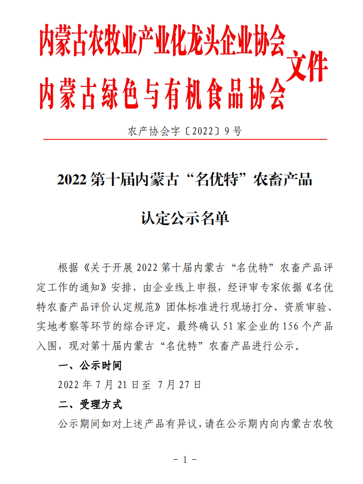 2022(第十屆)內蒙古“名優(yōu)特”農畜產(chǎn)品認定公示名單