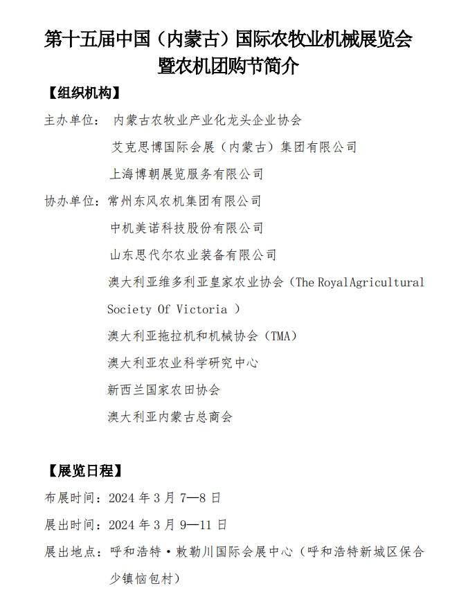 關(guān)于召開“2024年第十五屆中國(guó)(內(nèi)蒙古)國(guó)際農(nóng)牧業(yè)機(jī)械展覽會(huì)”通知