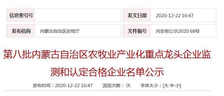 企業(yè)名稱:第八批內(nèi)蒙古自治區(qū)農(nóng)牧業(yè)產(chǎn)業(yè)化重點龍頭企業(yè)監(jiān)測和認(rèn)定合格企業(yè)名單公示