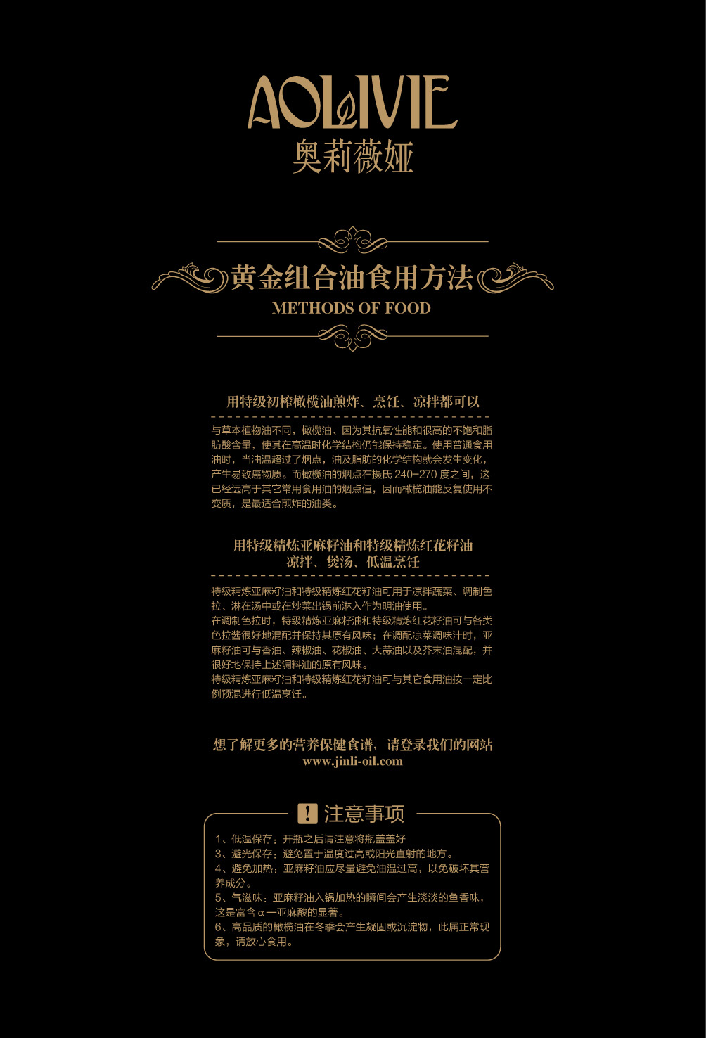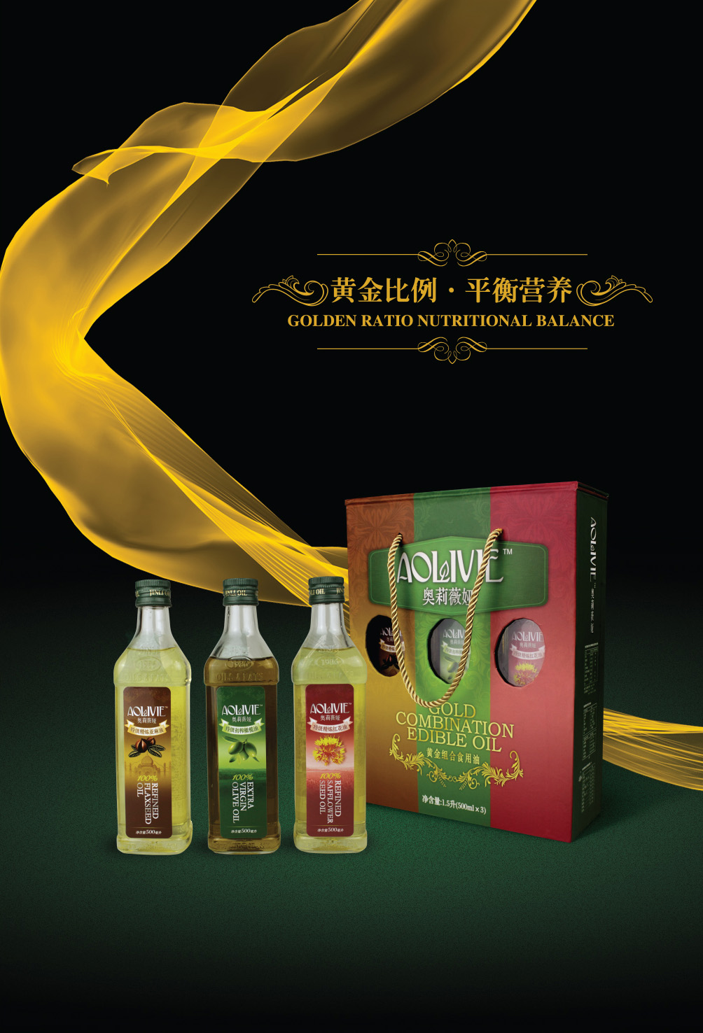 金利油脂(蘇州)有限公司研發(fā)的:“奧莉薇婭黃金組合植物營養(yǎng)油,有各具特色的脂肪酸植物油組合而成,將各種油品進(jìn)行優(yōu)勢互補,科學(xué)的根據(jù)人體營養(yǎng)需求,精心研制出的高端油脂系列產(chǎn)品。具有促進(jìn)大腦發(fā)育/增強(qiáng)視力/降脂/降血壓/抗血栓/保護(hù)前列腺/促進(jìn)脂肪代謝/抗衰老等良好的保健作用。為您均衡營養(yǎng)/增強(qiáng)體質(zhì)而“加油”?!皧W莉薇婭黃金組合油,是有特級初榨橄欖油/特級冷榨亞麻籽油/特級精煉紅花籽油三種油品組成,其中單不飽和脂肪酸/α—亞麻酸和亞油酸,是所有植物油中含量最高植物營養(yǎng)油。