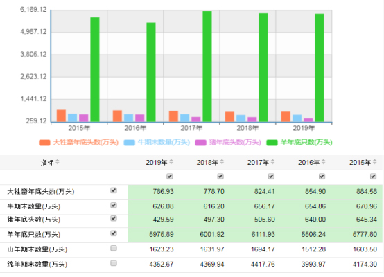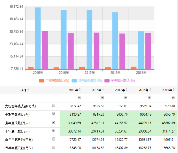 全國2015-2019年牛、羊、豬期末存欄情況