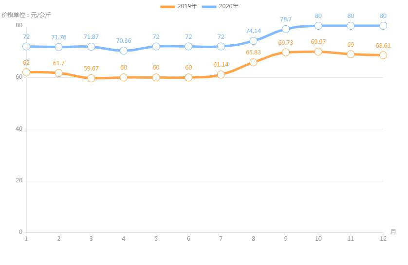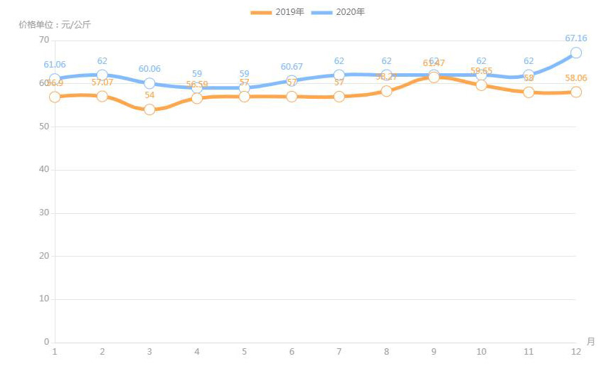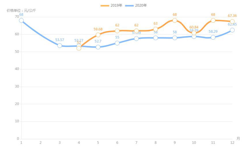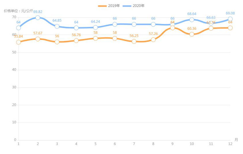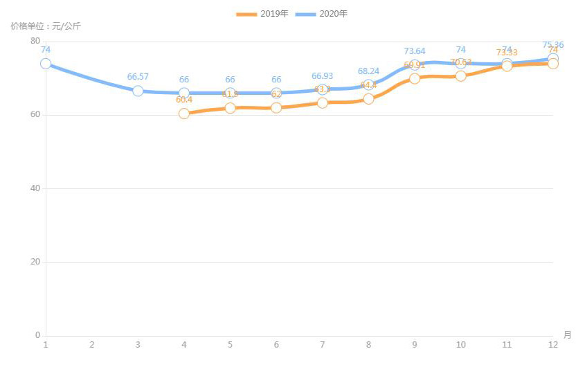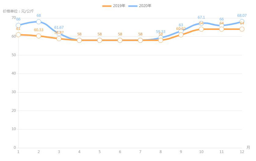 對(duì)內(nèi)蒙古幾大農(nóng)貿(mào)批發(fā)市場羊肉價(jià)進(jìn)行匯總分析得出:呼和浩特市內(nèi)蒙古美通農(nóng)產(chǎn)品批發(fā)市場羊肉最高價(jià)格出現(xiàn)在2020年11月68元/公斤,最低價(jià)格出現(xiàn)在2019年4月52元/公斤。呼和浩特市東瓦窯批發(fā)市場羊肉最高價(jià)格出現(xiàn)在2020年12月73.38元/公斤,最低價(jià)格出現(xiàn)在2019年5月61.08元/公斤。包頭市友誼蔬菜批發(fā)市場羊肉最高價(jià)格出現(xiàn)在2020年12月67.16元/公斤,最低價(jià)格出現(xiàn)在2019年3月54元/公斤。內(nèi)蒙古赤峰西城市場羊肉最高價(jià)格出現(xiàn)在2019年9月75.52元/公斤,最低價(jià)格出現(xiàn)在2019年3月56.97元/公斤。羊肉價(jià)格和去年同期相比整體上漲,漲幅基本在每公斤5-15元左右。